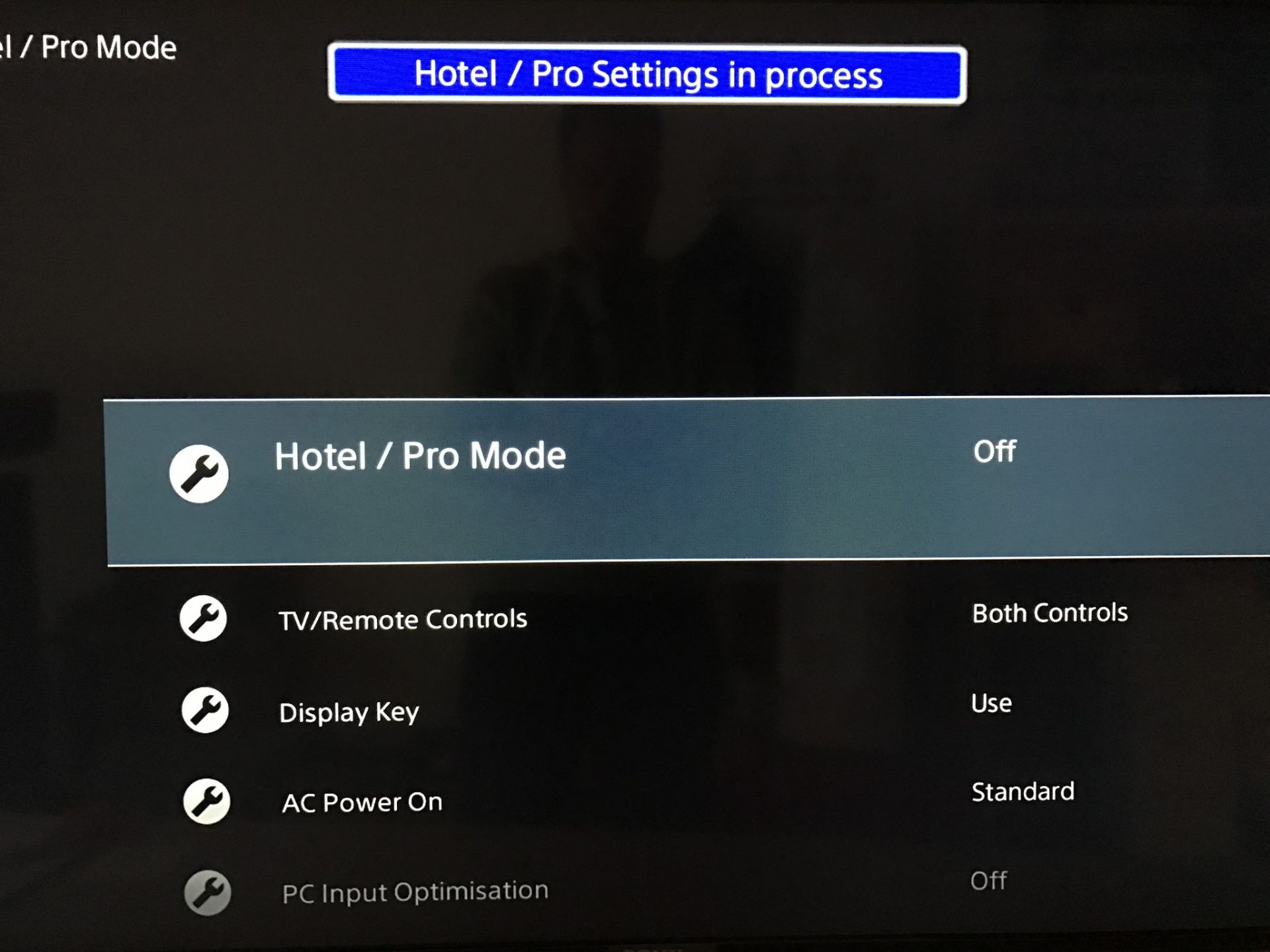 Enkelte versjoner av software eller andre modeller kan ha følgende sekvens for å aktivere innstillinger for Pro- / Hotel mode.