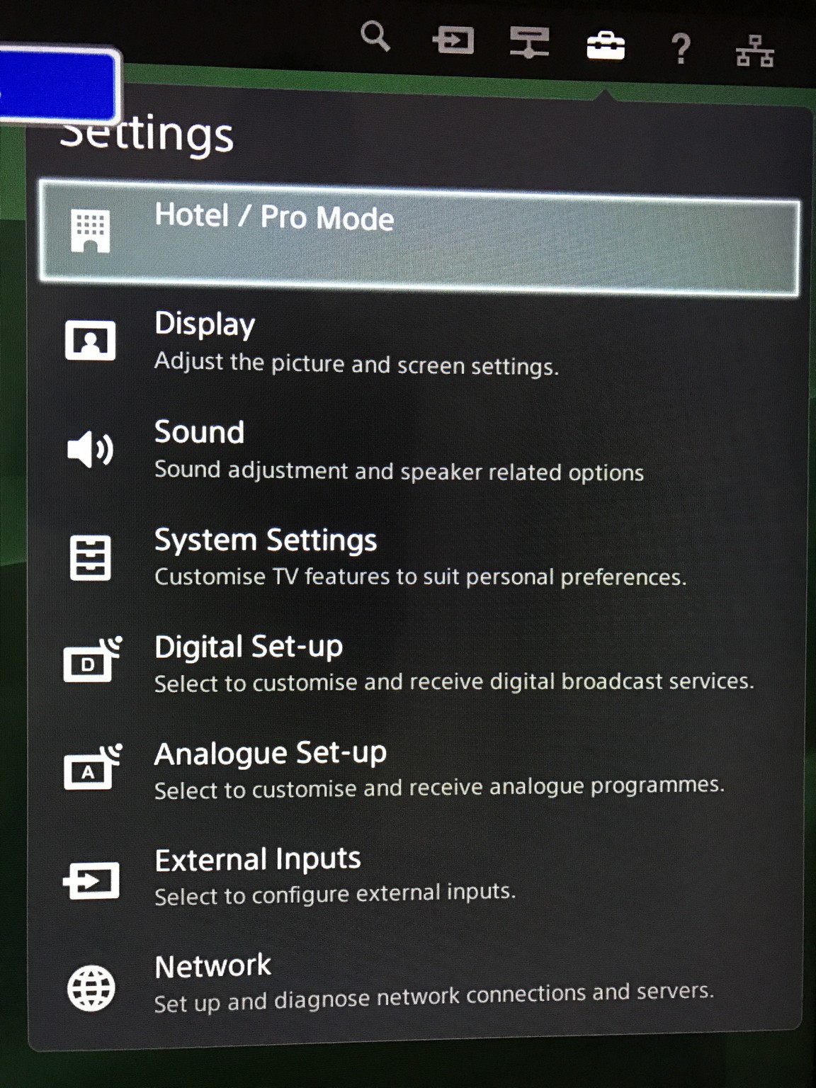 Dette er hvis du ønsker å gå ut av innstillingene når du er inne på de, altså når den blå linjen vises i toppen. TV-en vil automatisk gå ut av innstillingene når du slår på "Hotel / Pro mode", så denne sekvensen skal ikke være nødvendig.