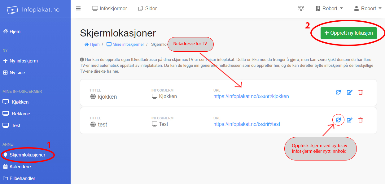 Du vil da få en egen nettadresse for valgt lokasjon som du kan legge inn på TV/PC. I ettertid kan du f.eks. endre hvilken infoskjerm du ønsker å vise på denne lokasjonen. Du kan også oppfriske infoskjerm på valgt lokasjon, f.eks. om du har nytt innhold du ønsker å vise med en gang eller at du har byttet infoskjerm.