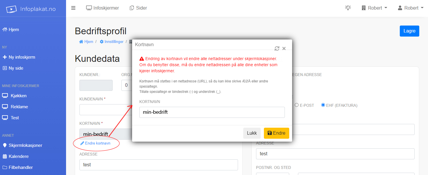 Du kan også endre firmanavn i nettadressen. Dette anbefales å gjøre før du legger den inn på TV-er / PC-er, slik at du slipper å endre.