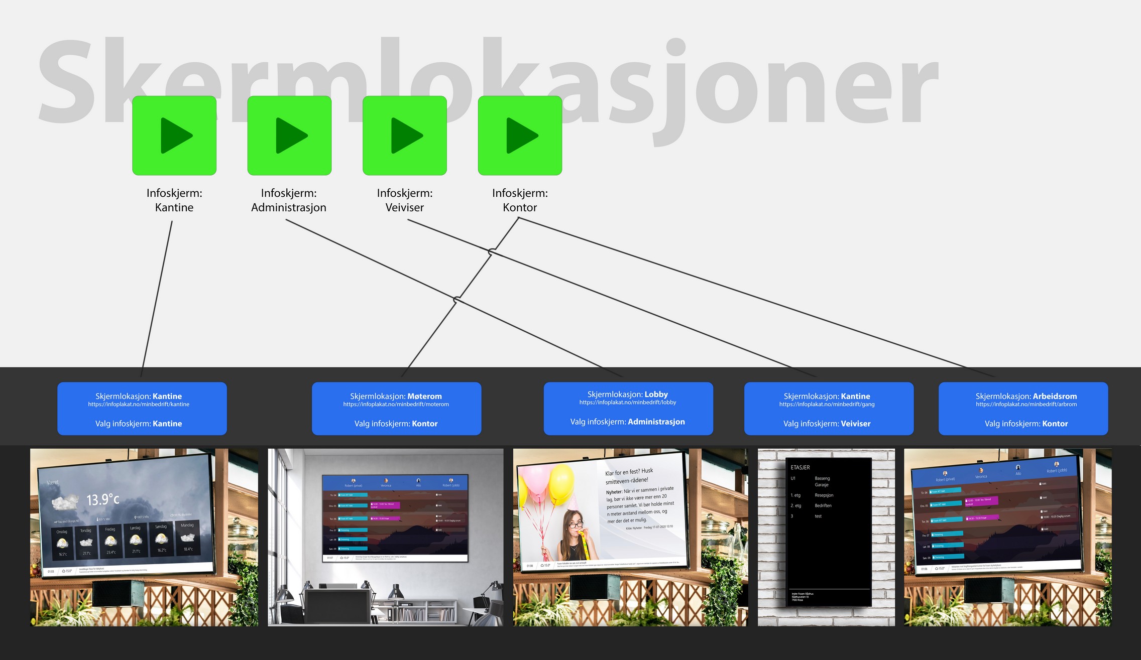 Det fungerer ved at du oppretter en lokasjon for hver TV. Hver TV får sin egen nettadresse. Deretter kan du velge hvilken infoskjerm som skal spilles av på hver lokasjon.