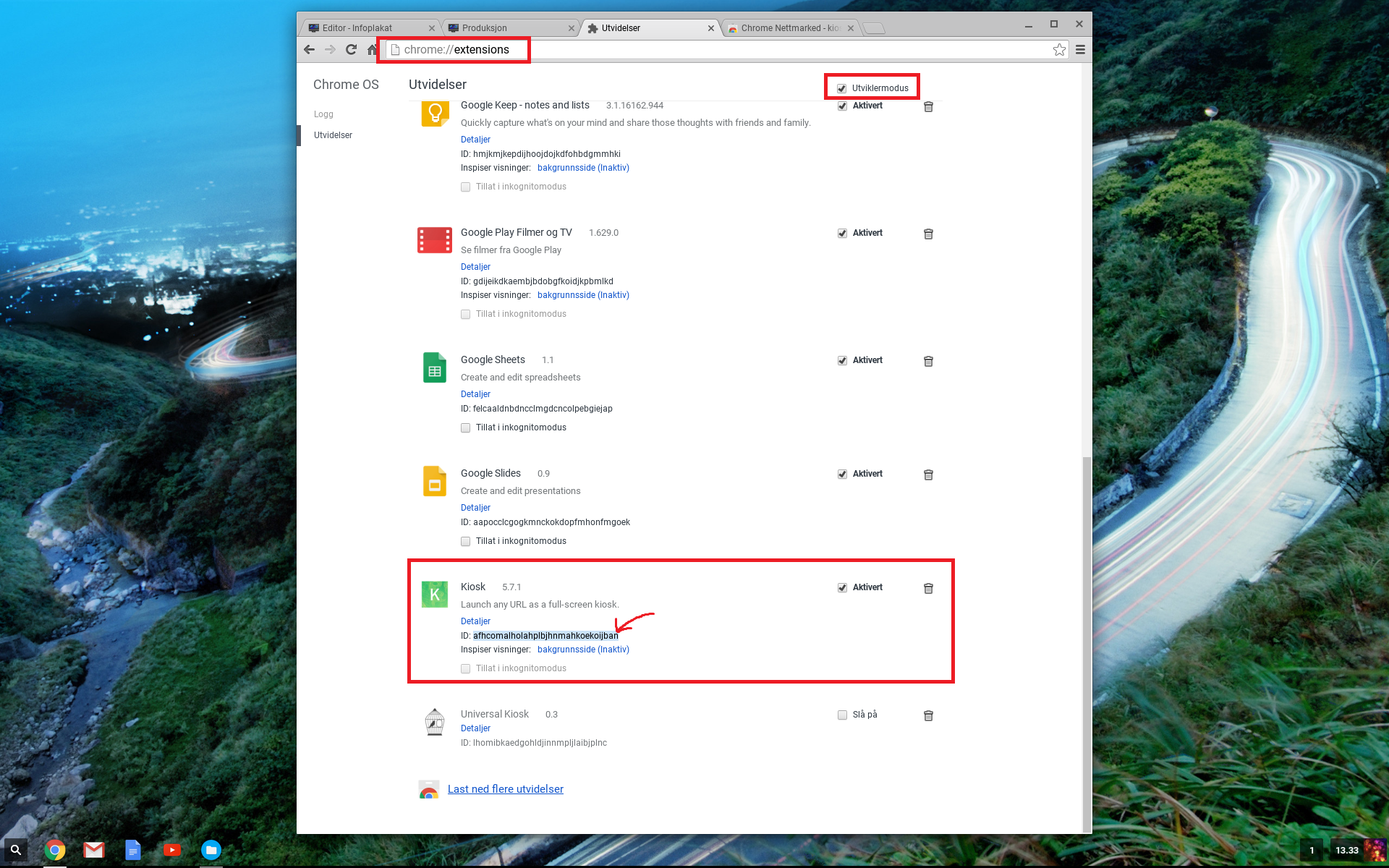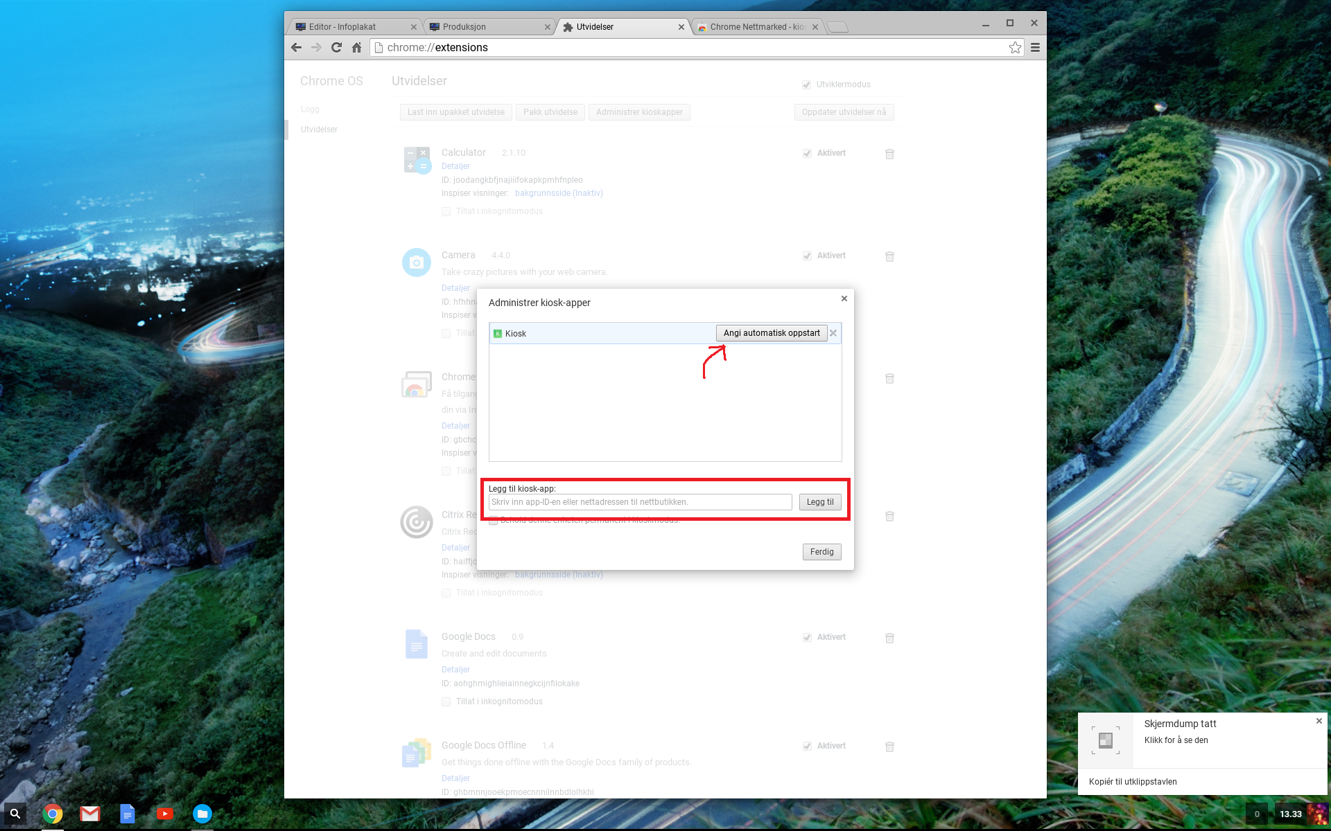 For å bruke kiosk-modus på ChromeOS krever Google at man nå har Google Enterprise avtale. Ta kontakt med oss om du ønsker kiosk-modus på din Chromebit/Chromebox, så kan vi gi deg tilbud på oppsett av dette.